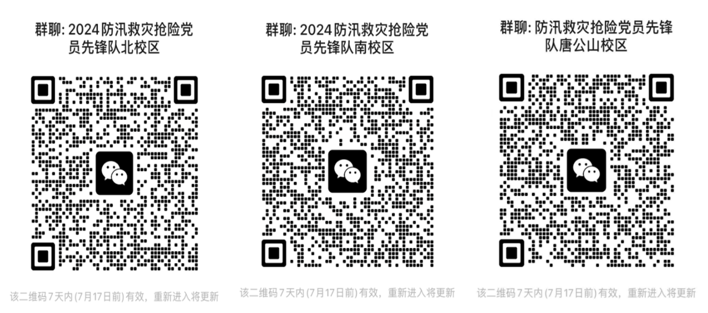 学校防汛救灾抢险党员先锋队设置北校区、南校区、唐公山校区三支分队,申请参加党员先锋队队员年龄一般不超过50岁。各基层党组织应积极动员广大党员根据居住地或工作地申请加入防汛救灾抢险党员先锋队,每支队伍人数一般不超过60名。党员可扫描以下二维码加入,为方便统计和联络,加入后请将名称更改为“姓名+单位”。联系人:李常艳,联系电话:3831311。