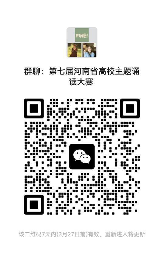 因二维码七天后失效,请参赛人员及时扫码先行加入“第七届河南省高校主题诵读大赛”微信联络咨询群,有关通知将在群中陆续发布,敬请关注。联系人:班亚平3831890 张霞3029933