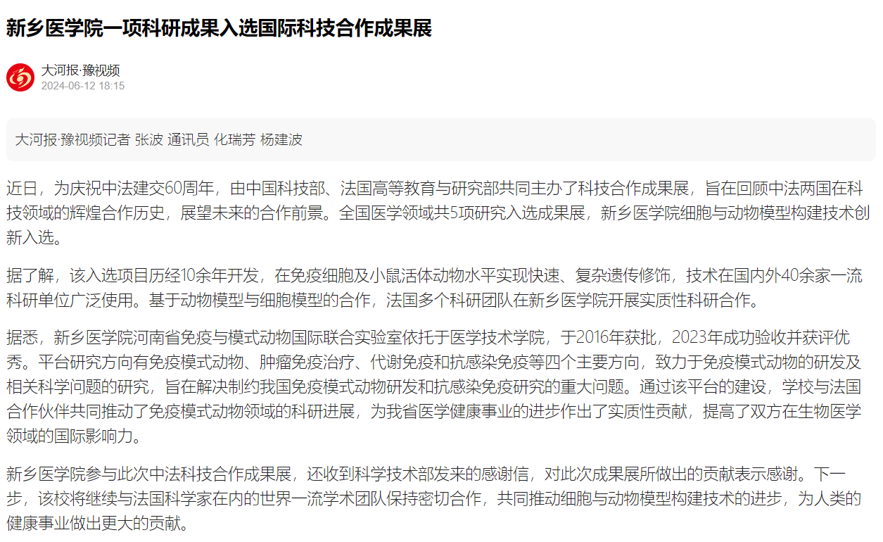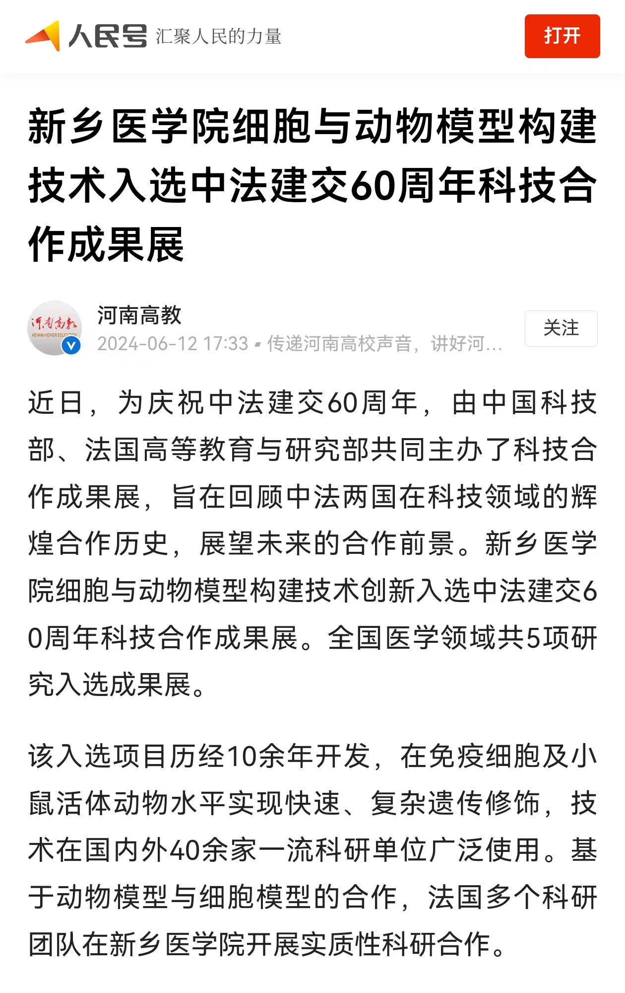 为庆祝中法建交60周年,中国科技部、法国高等教育与研究部共同主办了科技合作成果展。全国医学领域共5项研究入选成果展,我校细胞与动物模型构建技术创新入选。该入选项目历经10余年开发,在免疫细胞及小鼠活体动物水平实现快速、复杂遗传修饰,技术在国内外40余家一流科研单位广泛使用。基于动物模型与细胞模型的合作,法国多个科研团队在新乡医学院开展实质性科研合作。大河报客户端、人民日报客户端、顶端新闻、今日头条、河南高教等媒体报道。 (供稿:秦亚如)