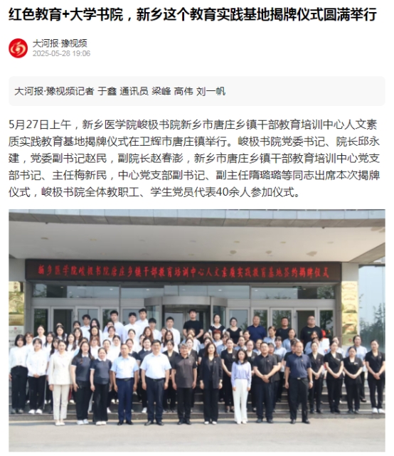 5月27日上午,新乡医学院峻极书院新乡市唐庄乡镇干部教育培训中心人文素质实践教育基地揭牌仪式在卫辉市唐庄镇举行。大河报·豫视频对该活动进行了报道。