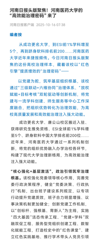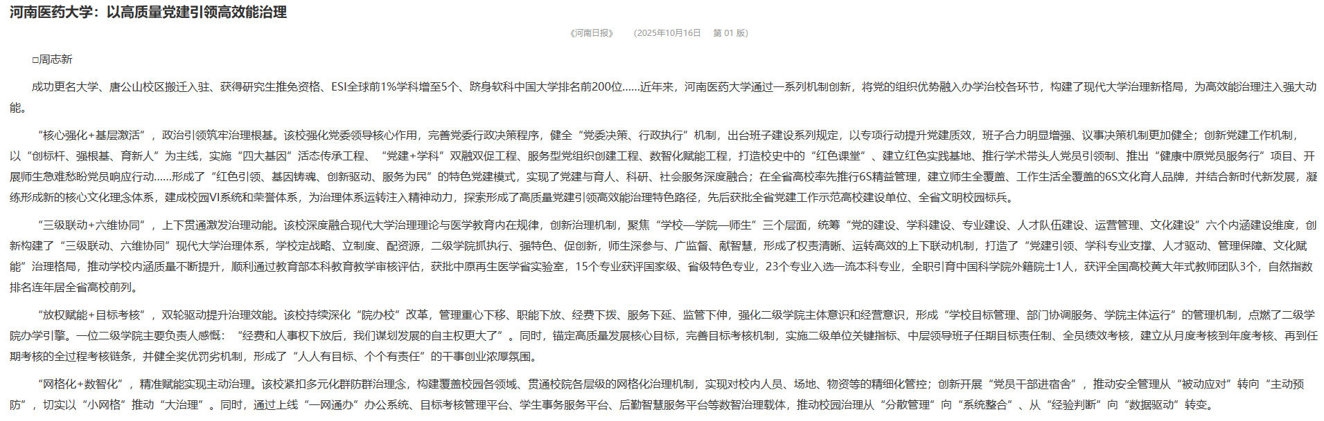 10月16日,《河南日报》头版显著位置聚焦我校高质量党建引领高效能治理。近年来,我校通过实施核心强化+基层激活、三级联动+六维协同、放权赋能+目标考核、网格化+数智化、纪律作风+执行力等一系列机制创新,政治引领筑牢治理根基,上下贯通激发治理动能,双轮驱动提升治理效能,精准赋能实现主动治理,动真碰硬破解治理壁垒,切实将党的组织优势融入办学治校各环节,构建了现代大学治理新格局,为高效能治理注入强大动能。