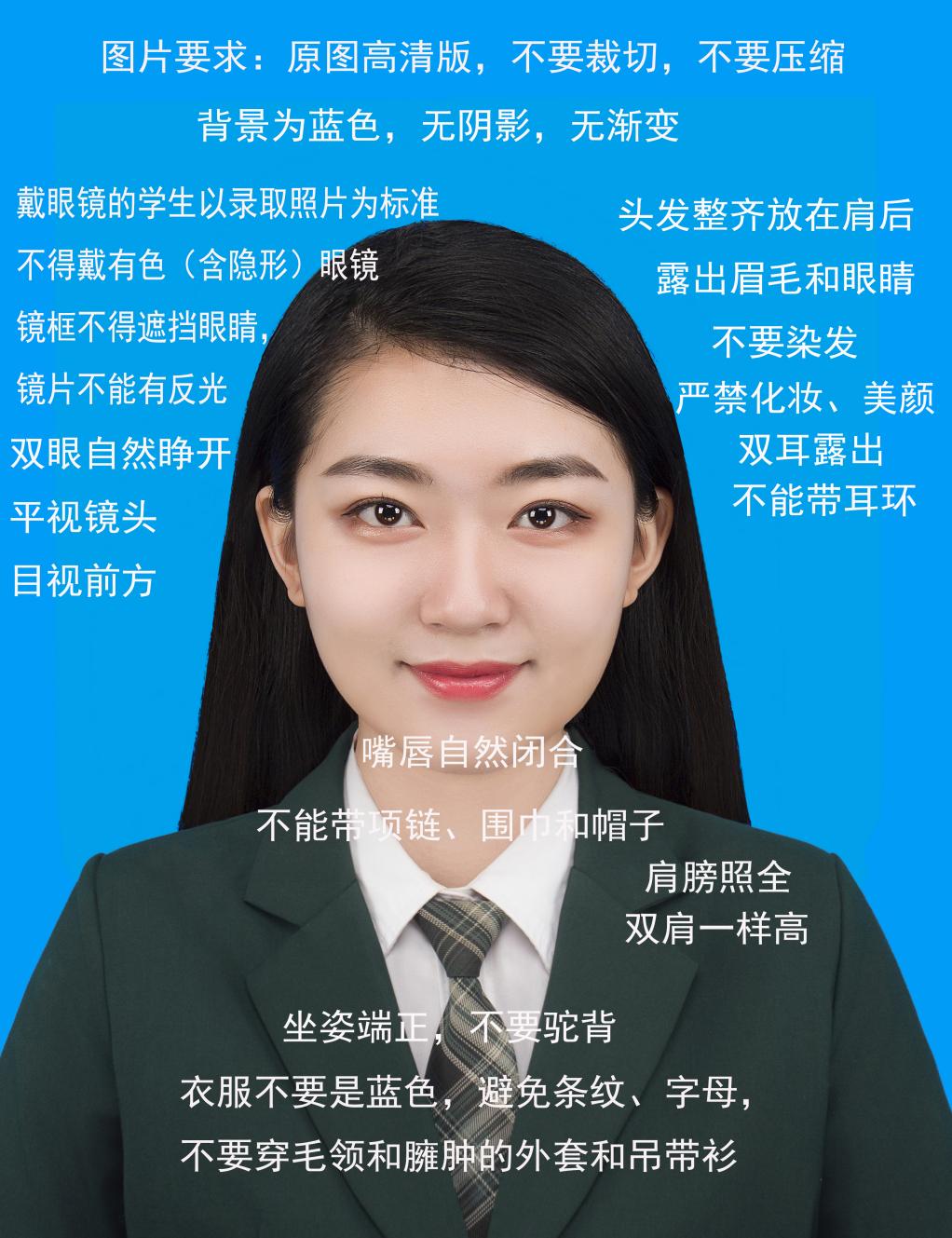 (6)不要浓妆艳抹,不要佩戴围巾、帽子、项链、耳饰和发卡,戴眼镜的学生如镜片反光请取掉眼镜,裸视照相;