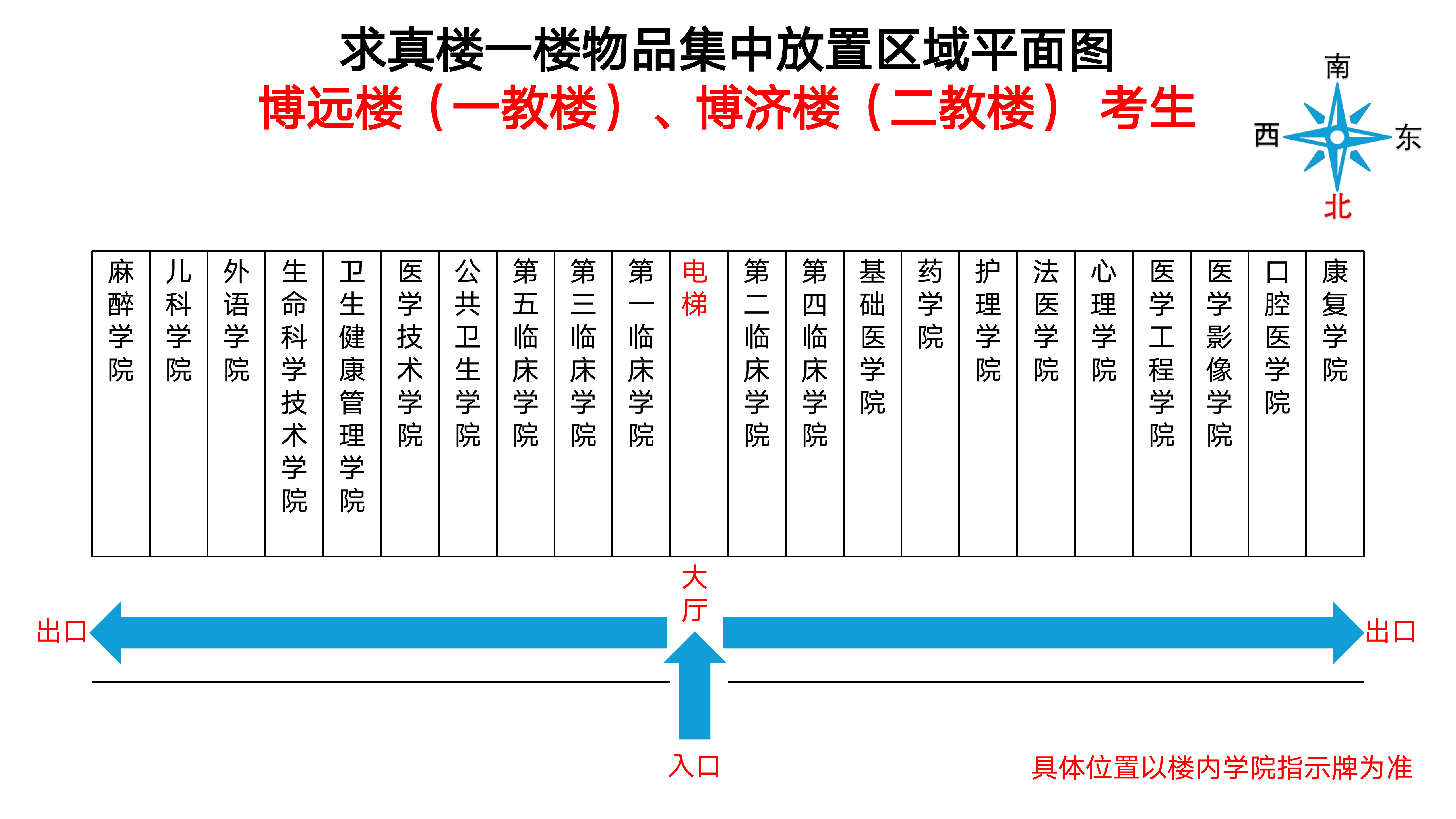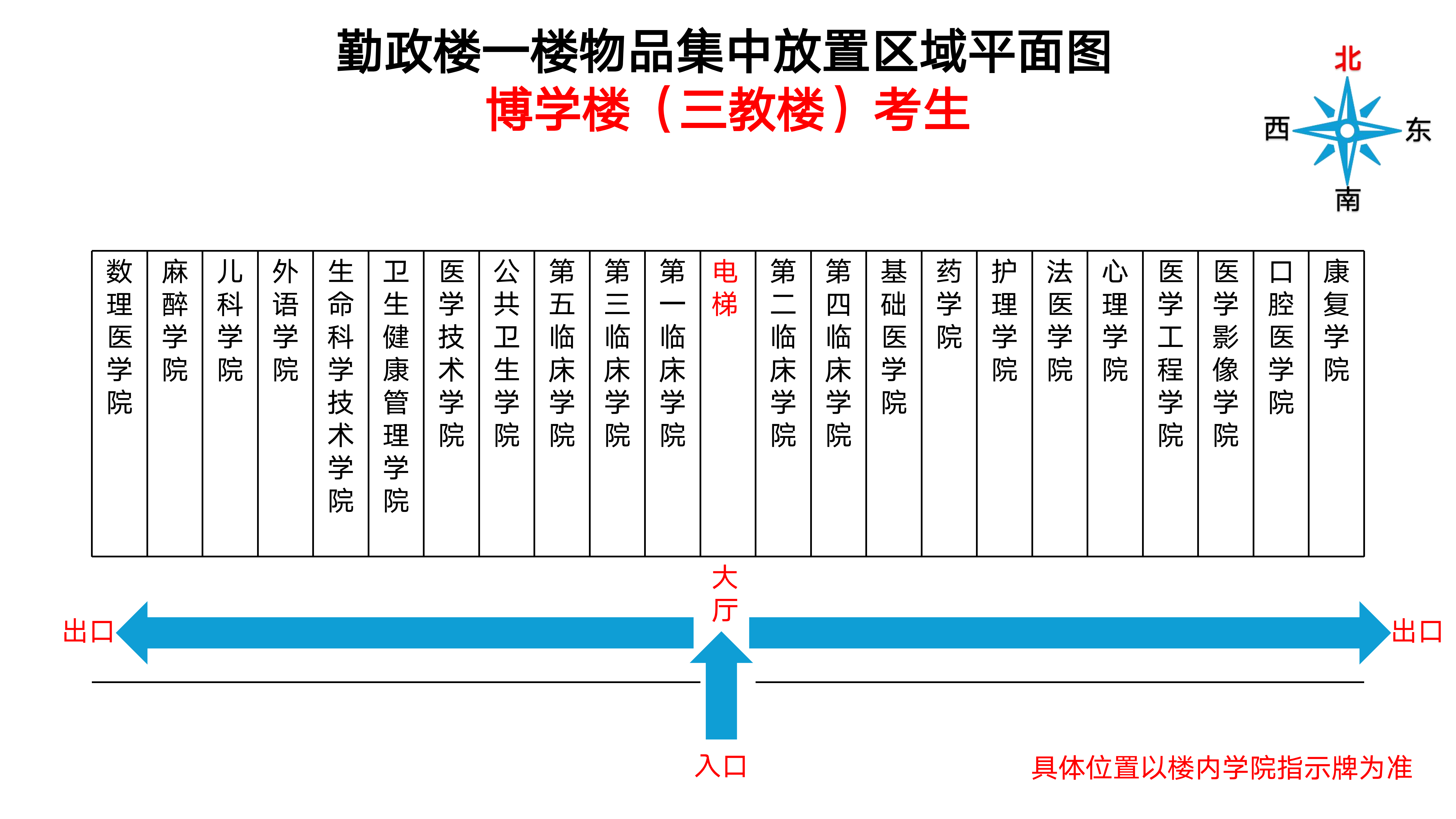 考生到达考点后,应把准考证、身份证和规定文具以外的物品提前放置在考点指定区域,博学楼考生物品存放处:勤政楼一楼。博济楼、博远楼考生物品存放处:求真楼一楼大厅。考生须在工作人员的引导下有序通过安检门安检。如引发安检门报警,考生须将引发报警的物品自行放置到考点指定位置,并再次通过安检门,不再报警方为合格。对于经反复安检后设备仍报警的,考生须服从工作人员安排。