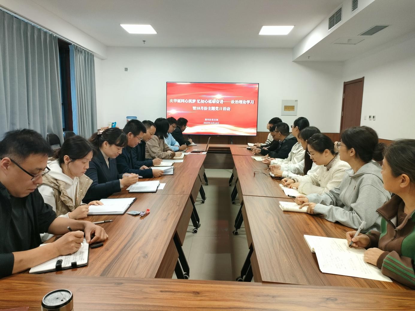 为深入学习贯彻习近平新时代中国特色社会主义思想,凝聚党员力量、激发奋斗热情,10月16日下午,期刊社党支部在党建活动中心开展庆华诞同心筑梦,忆初心砥砺奋进——政治理论学习暨10月份主题党日活动,支部书记徐自超主持会议,全体教职工参加。