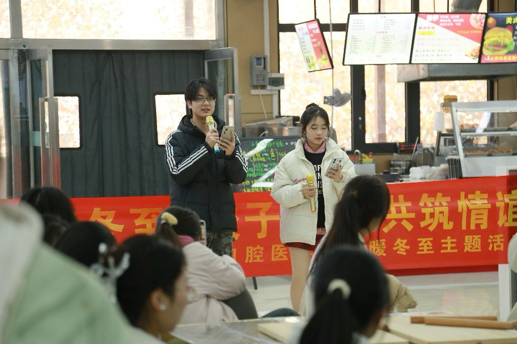 为弘扬中华优秀传统文化,增强学生动手能力及协作能力,口腔医学院于12月20日下午15时,在南校区知味堂二楼举办了主题为“口腔医韵,温情冬至;饺子飘香,共筑情谊”的情暖冬至主题活动。辅导员老师张森利、张科峰与口腔医学院学生们共同参与了此次活动。
