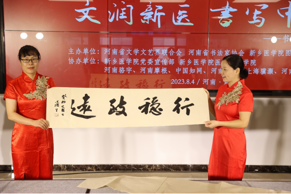 刘国庚在致辞中表示,新乡医学院作为我省唯一独立建制的西医本科院校,始终坚持深入落实习近平总书记“推进健康中国建设”“把保障人民健康 放在优先发展的战略位置,完善人民健康促进政策”的重要指示精神,始终坚守中华文化立场、传承中华文化基因,始终坚定不移落实立德树人根本任务。学校高度重视素质教育,设置医学人文学院和艺术教育中心,全力打造医学人文教育与研究的主阵地。学校立足加强医学人文教育的探索与实践,以创建富有特色的医学人文课程体系为抓手,加强医学人文课程内涵建设,坚持显性教育与隐性教育相结合,多渠道培养有人文精神的医学人才,努力将医学人文教育贯穿医学教育的全过程,通过价值塑造、知识传授、能力培养和文化熏陶,将深厚的人文精神融入医学教育中,培养德智体美劳全面发展的社会主义建设者和接班人。吴行主席一行莅临新乡医学院传经送宝,通过开展中华传统文化进校园活动,引领师生了解书法文化,感受书法艺术,体验书法之美,为新乡医学院广大师生带来了高品质的书法艺术体验,学校将以此次活动为契机,深入推进素质教育,大力弘扬优秀传统文化,为学校建设特色鲜明的现代化医科大学继续努力。