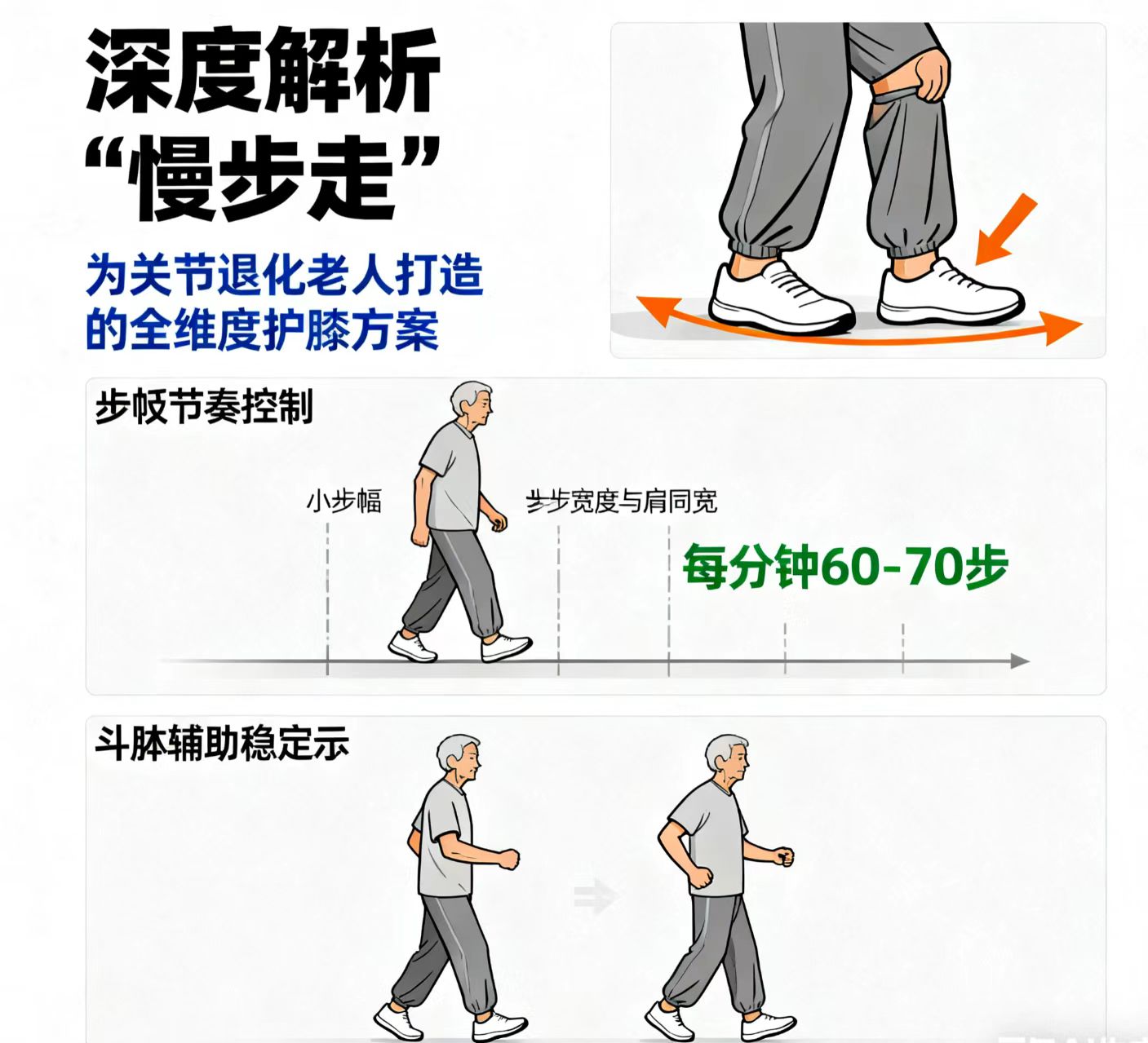 对膝关节退化的老人来说,“慢步走”不仅是“放慢速度”的行走,更是一套融合动作科学、场景适配、肌力协同与风险规避的综合护膝策略,能在保护关节的同时,最大化维持身体机能。