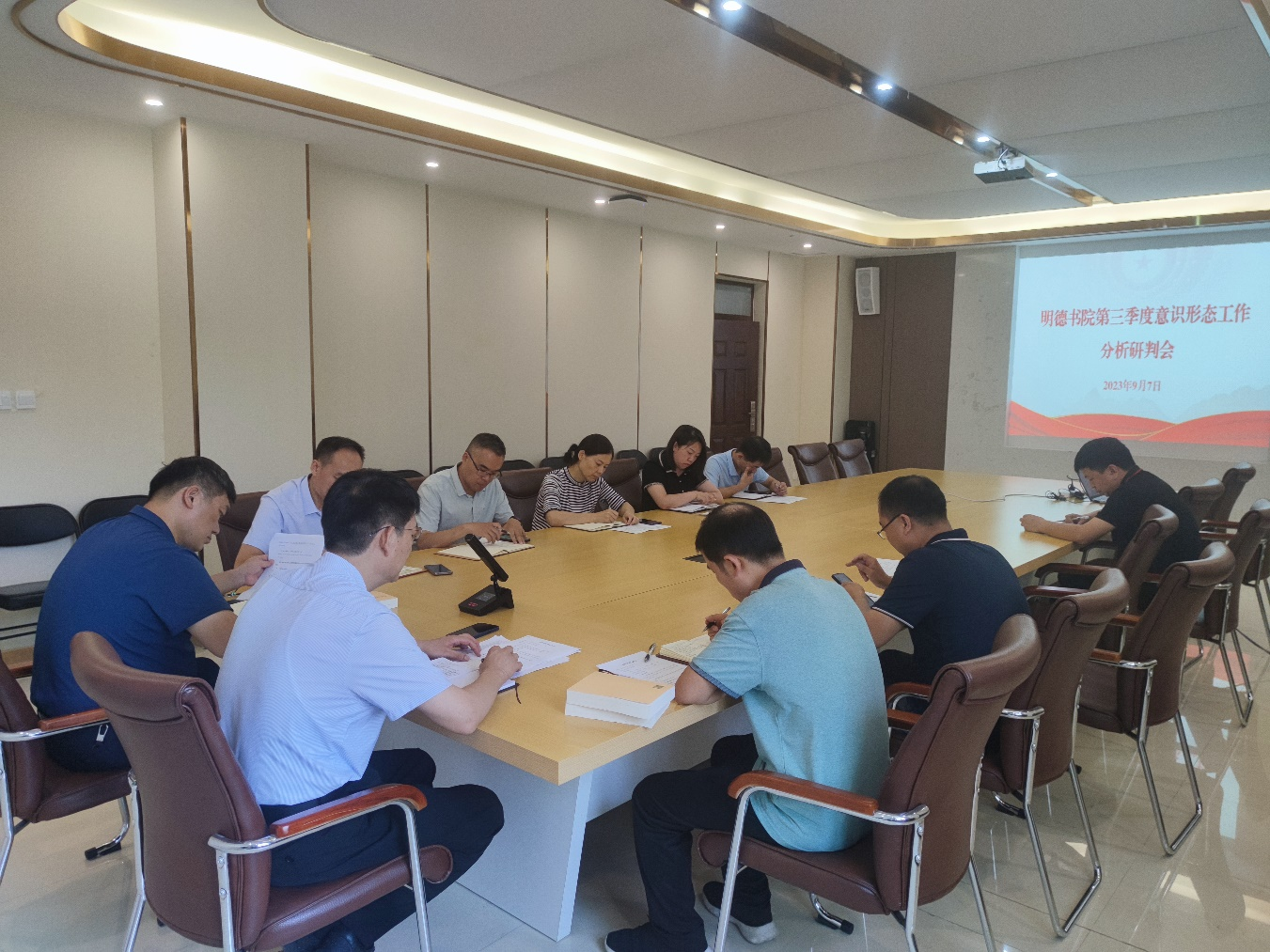 9月7日上午,明德书院在会议室召开2023年第三季度意识形态工作分析研判会。院长邱永建,副书记李强,副院长雒国胜、赵春澎,副处级组织员刘迎辉以及各科室负责同志参加会议。党委书记王正晓主持会议并讲话。