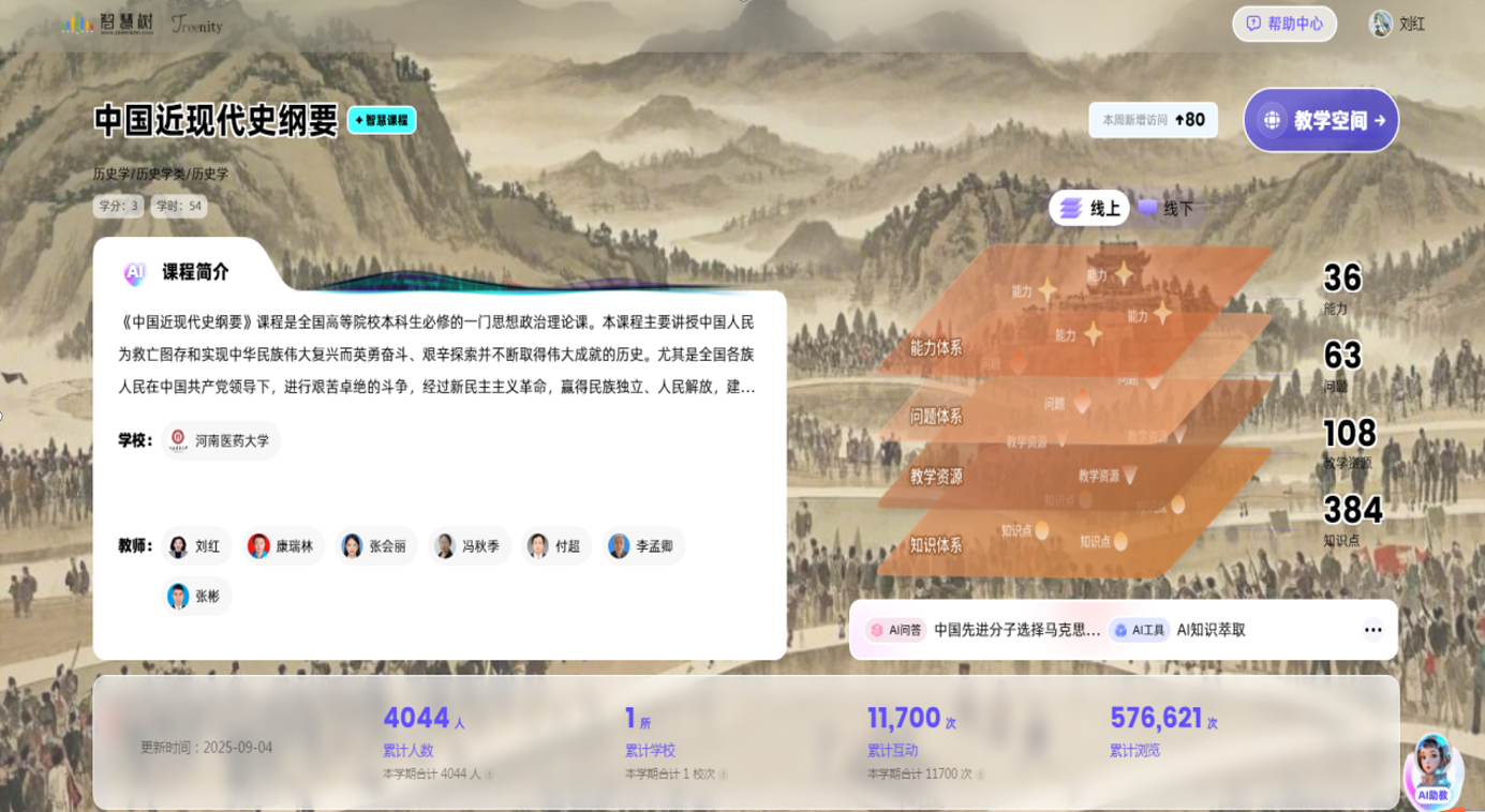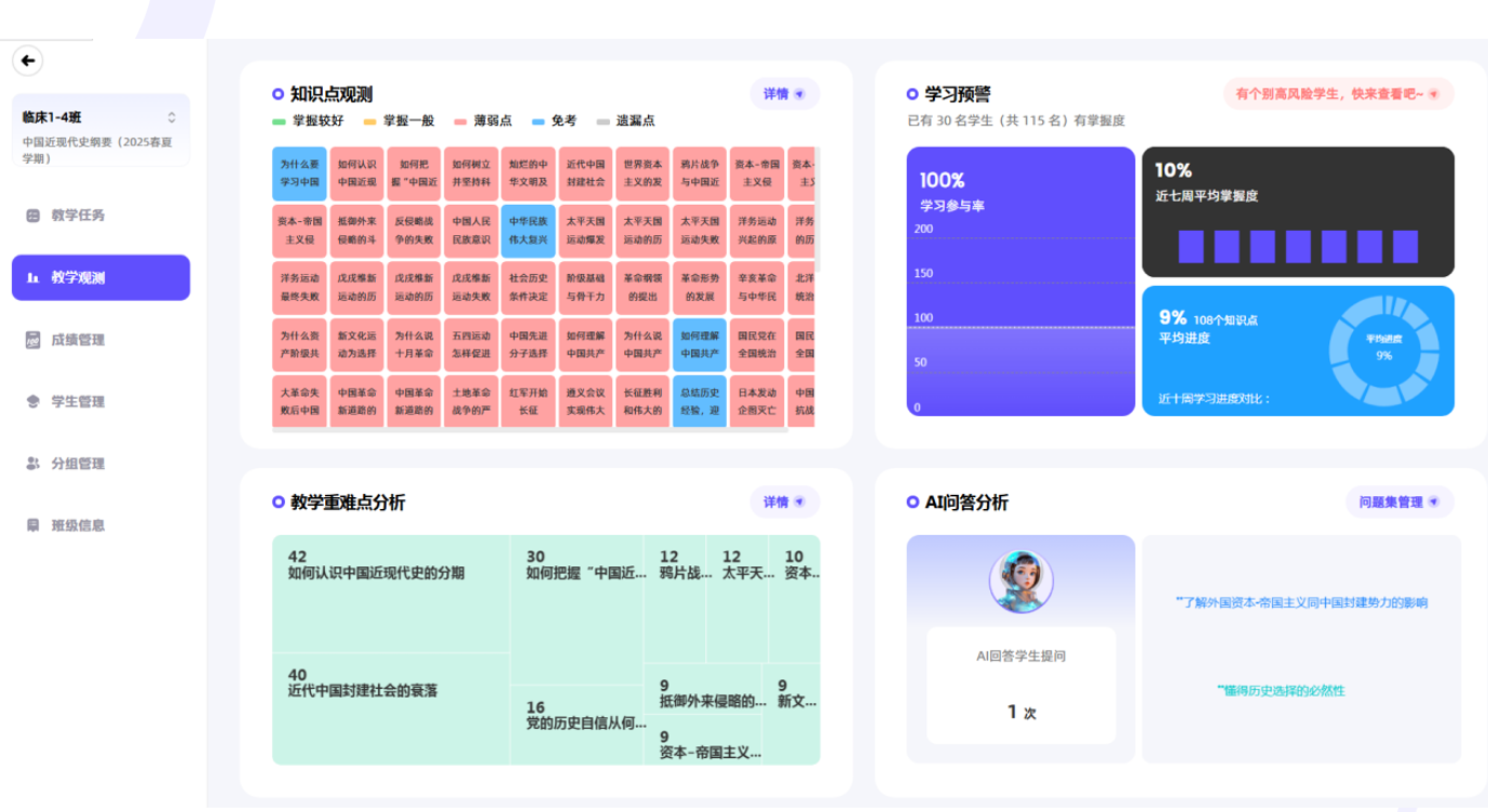 一是“智赋精准”聚焦双重变革。一方面赋能学习革命,依托AI学情分析、规划个性化学习路径,通过AI助手实现精准答疑与资源推送,推动学生学习方式从“知识接受”向“问题探究”深化。另一方面赋能教学增效,借助知识图谱工具重塑内容体系,AI助手辅助备课,依托虚拟仿真重塑历史情境,全面提升授课质量。
