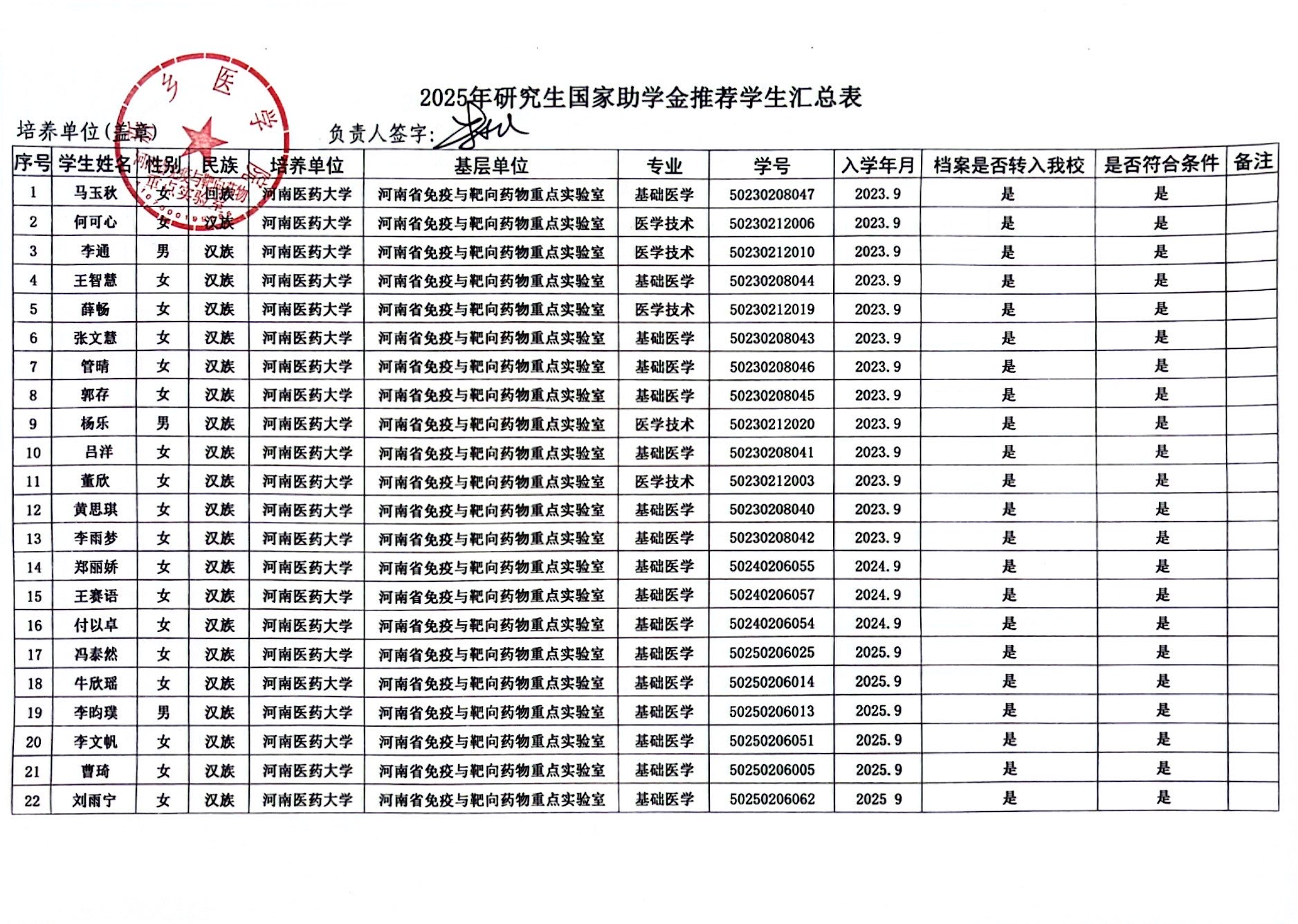 河南省免疫与靶向药物重点实验室2025年硕士研究生国家助学金推荐学生汇总表