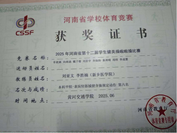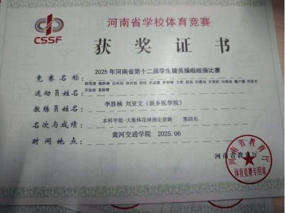 本网讯(杨萌/文)5月29日-6月4日,河南省第十二届学生健美啦啦操比赛在黄河交通学院举行,我院学子李成慧作为我校代表队队员参加比赛,并荣获佳绩。