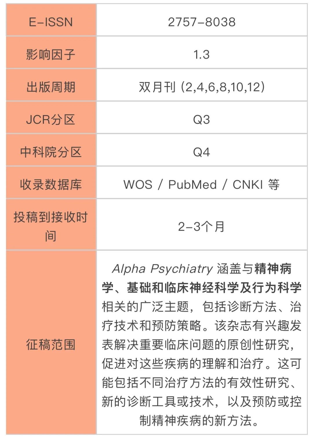 Alpha Psychiatry(AP)是一本国际性、开放获取、同行评审期刊,目前分区为JCR 3区,中科院四区,影响因子为1.3。期刊涵盖与精神病学、基础和临床神经科学以及行为科学相关的广泛主题,包括诊断方法、治疗技术和预防策略。期刊有兴趣发表原创研究,解决重要的临床问题并促进对这些疾病的理解和治疗。这可能包括对不同治疗方法的有效性、新的诊断工具或技术以及预防或管理精神疾病的新方法的研究。