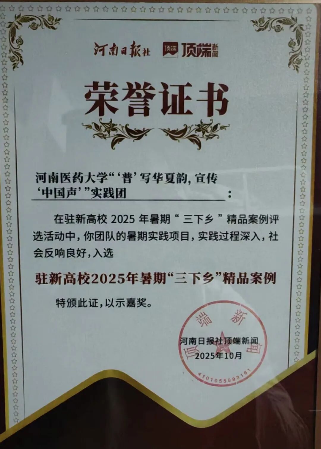 本网讯(图文/张晏硕)近日,我院“‘普’写华夏韵,宣传‘中国声’”实践团凭借扎实的暑期实践成果,成功入选驻新高校2025年暑期“三下乡”精品案例,河南日报社顶端新闻为团队颁发荣誉证书。
