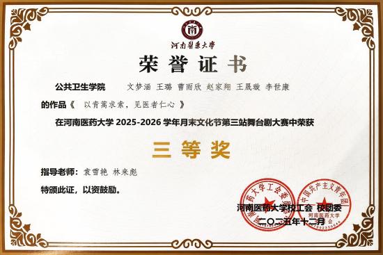 2025年12月29日,河南医药大学2025-2026学年月末文化节第三站舞台剧大赛决赛在西校区研究生学院二楼南报告厅举行。我院2023级卫生检验与检疫专业学生文梦涵、李世康、王璐、王晟璇,2023级预防医学专业学生曹雨欣和2024级卫生检验与检疫专业学生赵家翔组队参加的作品《以青蒿求索,见医者仁心》荣获三等奖。(供稿 袁雪艳 林来彪)
