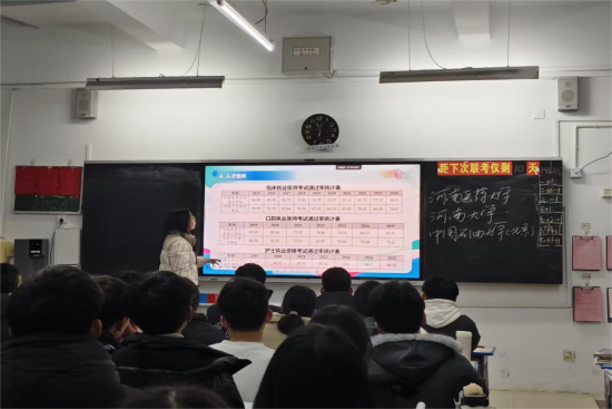 活动当天,团队分两组深入两个班级,开展以“遇见河医”为主题的宣讲。在专业介绍环节,成员结合自身学习经历,详细介绍了临床医学、医学检验技术、预防医学、卫生检验与检疫等专业的特色,并系统讲解了各专业课程设置与就业方向,帮助同学们对医学专业与发展前景有了更清晰、全面的认识。