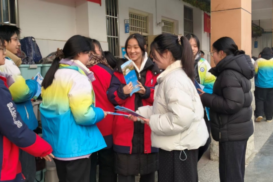 除室内宣讲外,团队还利用课间时间,在高三教学楼出入口设立流动咨询点,开展“第二课堂”宣传。队员们手持宣传册,主动为来往学生提供简要介绍和资料补充,吸引众多同学驻足了解,进一步扩大了宣传覆盖面。