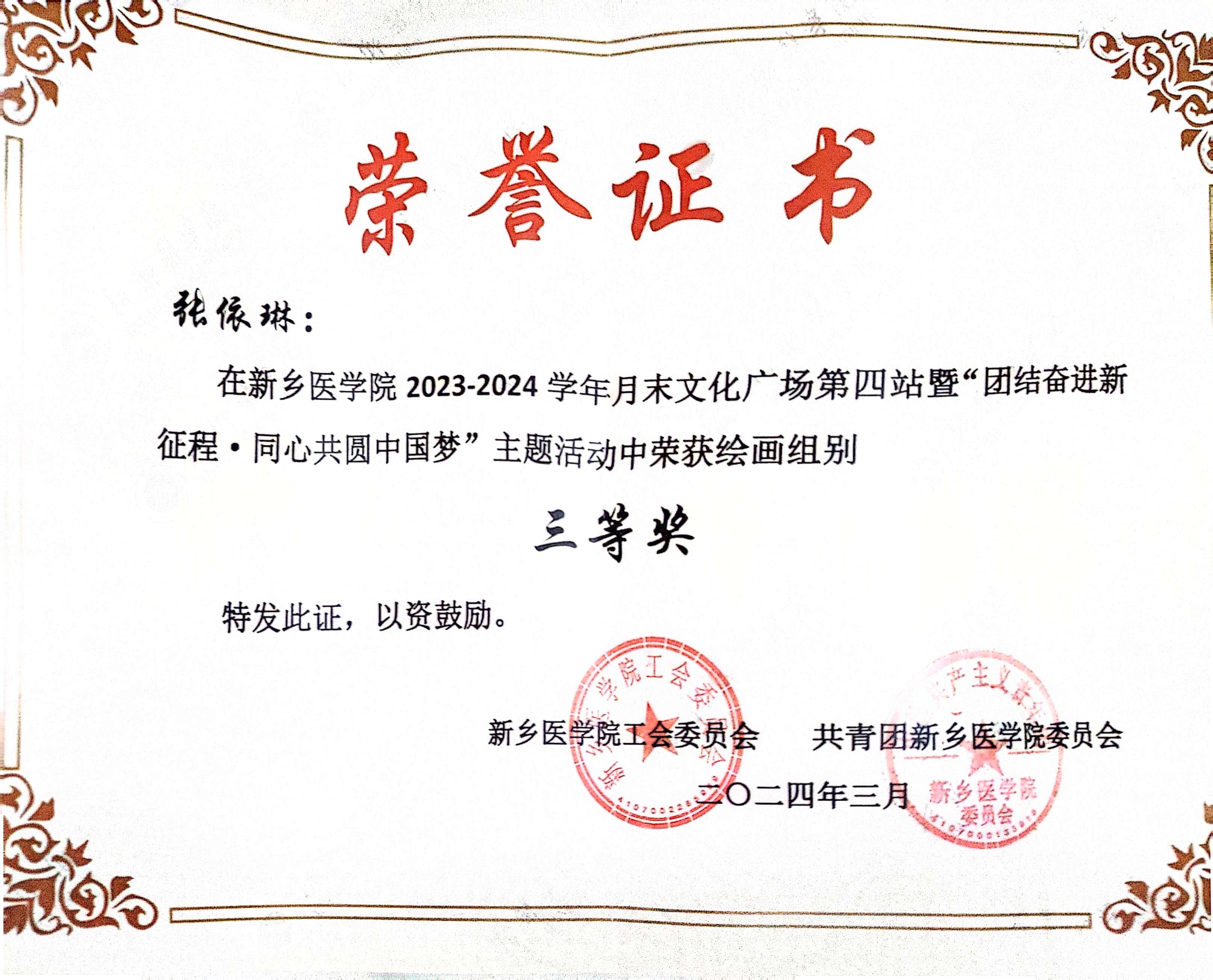 个人简介:张依琳,女,共青团员,河南医药大学公共卫生学院2023级卫生检验与检疫1班学生,曾担任院学生会文艺部干事,校青媒新闻部干事。曾荣获2024-2025学年国家励志奖学金;获评2024年校暑假文化科技卫生“三下乡”社会实践活动“优秀个人”荣誉称号。