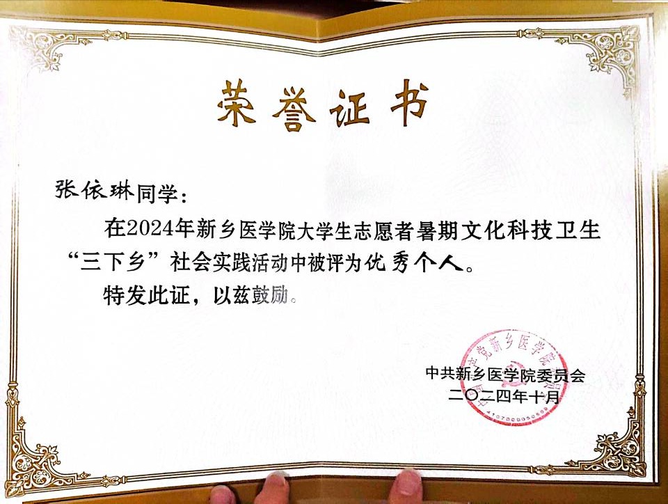 “躬行践履始玉成,行而不辍终致远”。张依琳积极参与社会实践活动,曾参加2023-2024学年、2024-2025学年大学生暑假“三下乡”实践活动,并获评2024年校“三下乡”社会实践活动“优秀个人”的荣誉称号;在社区帮扶项目中,她为老人测量血压,并耐心讲解从饮食方面控制血压以及科学减重的相关知识。她认为,专业不仅是课本上的理论,更是脚下沾满泥土的真诚,这些实践经历不仅锻炼了她的沟通协调与执行能力,也让她对专业价值和社会责任有了更具体、更深刻的理解。