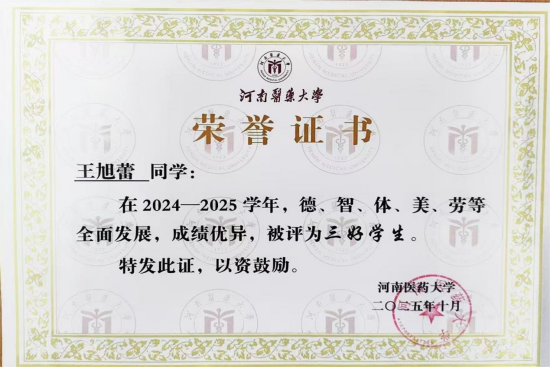 “知者行之始,行者知之成。”进入大学以来,王旭蕾始终坚持知行合一、学以致用。学习上,她态度认真、脚踏实地,紧跟课堂节奏,系统梳理知识,严谨对待每一个学习环节。同时,她积极参与主题演讲等各类校园活动,在实践中不断锤炼表达能力、思辨能力与临场应变能力,稳步提升综合素养。凭借扎实的学业表现与全面的综合素质,她在2024-2025学年荣获国家励志奖学金,获评河南医药大学“三好学生”的荣誉称号,真正实现了学业与实践的双向成长。