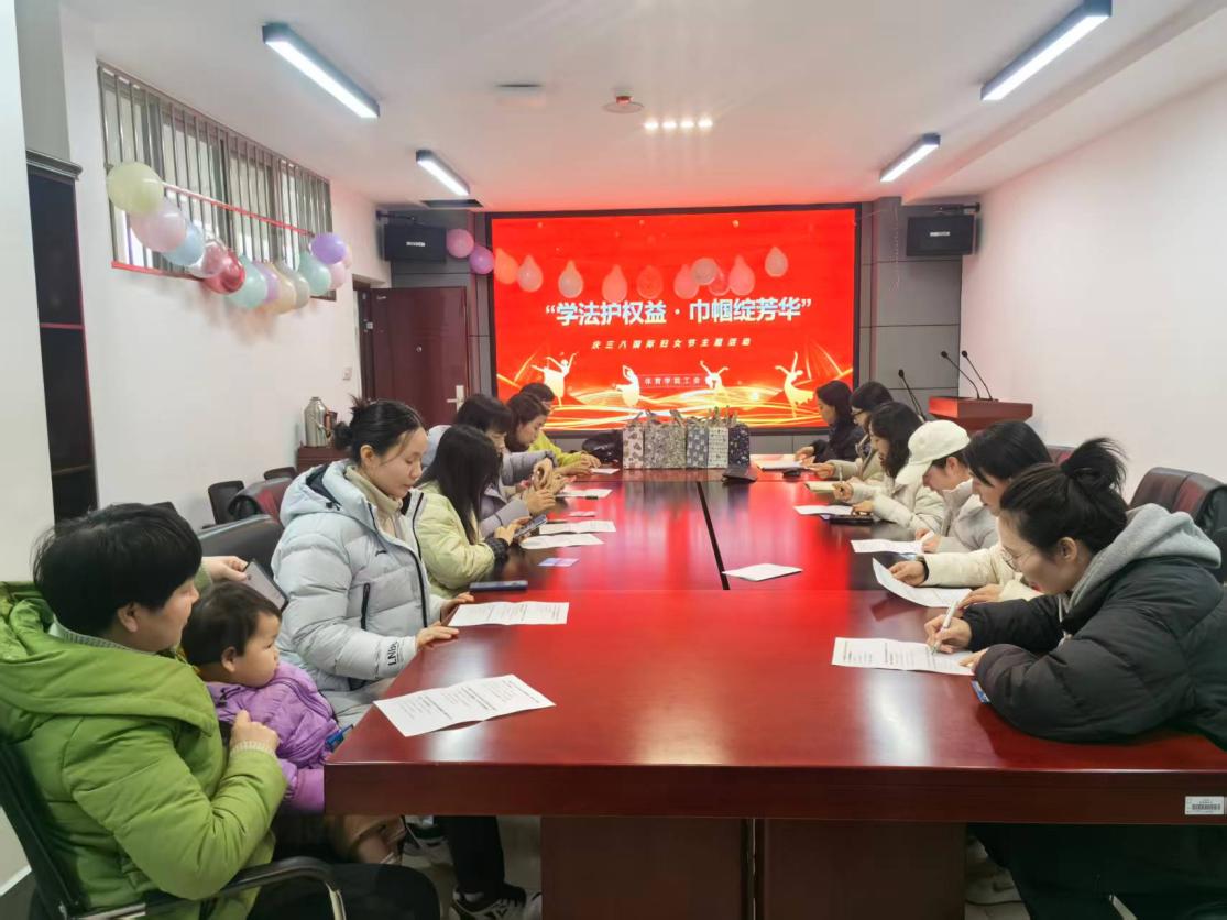 为庆祝第116个“三八”国际劳动妇女节,切实维护女职工合法权益,增强女职工法律意识和维权能力,3月6日,体育学院在学院会议室开展 “学法护权益・巾帼绽芳华”女职工权益保护知识普及活动,学院全体女职工齐聚一堂,在沉浸式学习中欢度节日、共增才干。