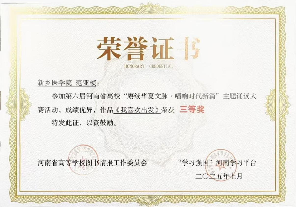 近日,第六届河南省高校“赓续华夏文脉·唱响时代新篇”主题诵读大赛评选结果揭晓,我院辅导员范亚桢凭借作品《我喜欢出发》荣获三等奖,展现了我院教师优秀的文化素养与精神风貌。