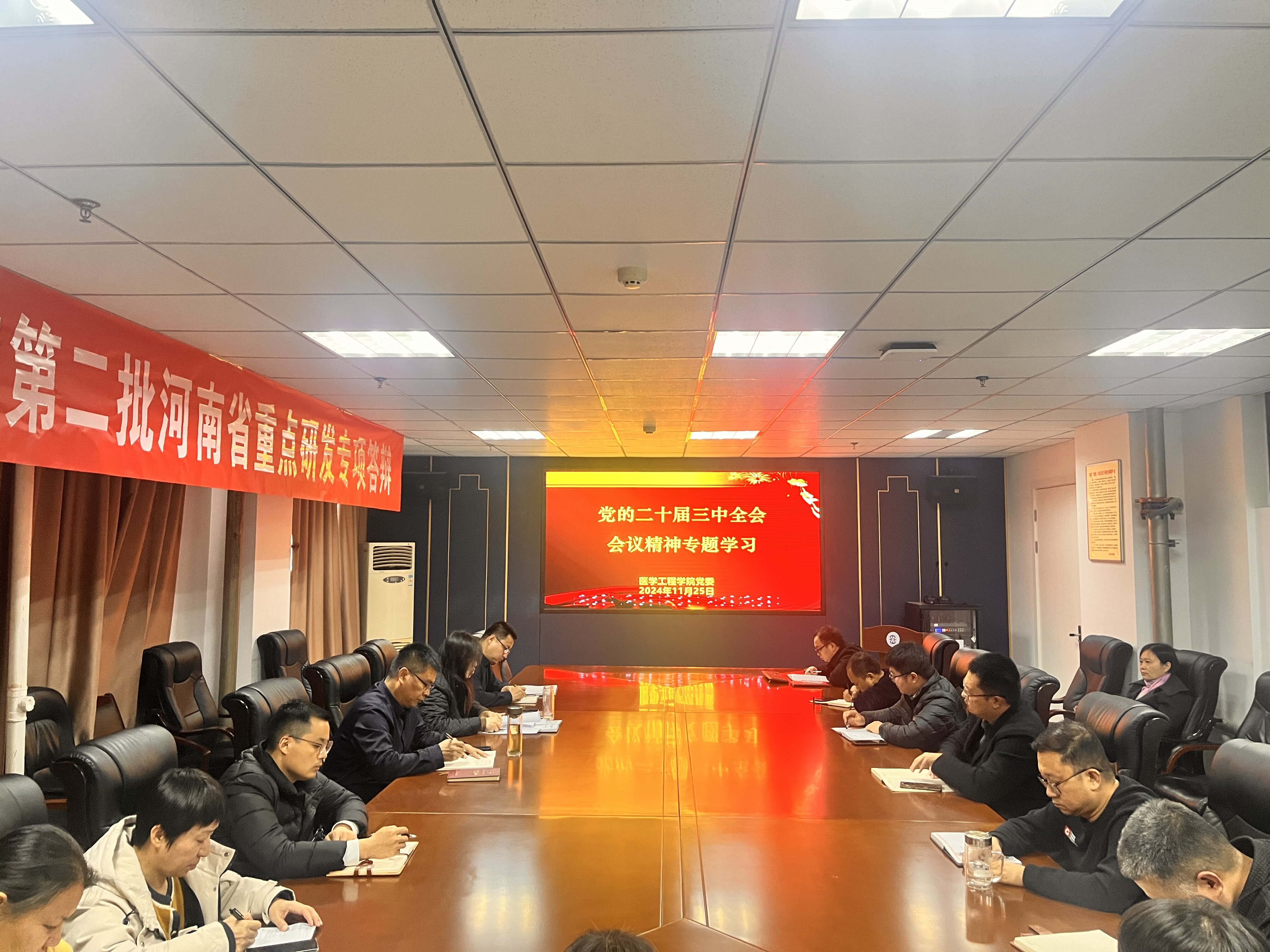 11月25日上午,医学工程学院党委在科技楼716会议室召开理论学习中心组(扩大)会议专题学习党的二十届三中全会精神,学院领导班子成员、支部书记和科级干部代表参加会议,学院党委书记王守英主持会议。