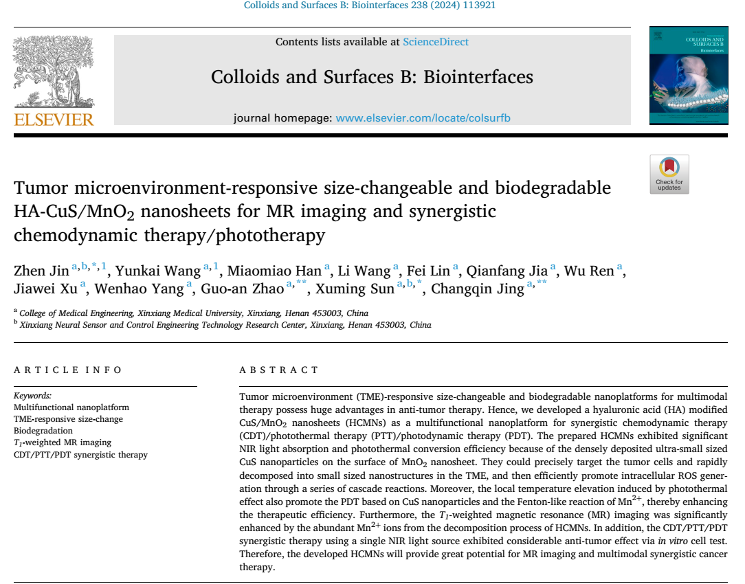 近日,我院金珍博士在国际知名期刊《Colloids and Surfaces B: Biointerfaces》上发表了题为“Tumor microenvironment-responsive size-changeable and biodegradable HA-CuS/MnO2 nanosheets for MR imaging and synergistic chemodynamic therapy/phototherapy”的研究论文。该研究开发了一种透明质酸(HA)修饰的CuS/MnO2纳米片(HCMNs)作为协同化学动力学疗法(CDT)/光热疗法(PTT)/光动力疗法(PDT)的多功能纳米平台。所制备的HCMNs表现出优异的光热转换效率。它们可以精确地靶向肿瘤细胞并在TME中快速分解成超小尺寸的纳米结构,并通过一系列级联反应有效促进细胞内活性氧(ROS)的产生。另外,光热效应可促进基于CuS纳米粒子的PDT作用和Mn2+离子的类Fenton反应,从而提高了治疗效率。此外,HCMNs分解过程中产生的Mn2+离子显着增强了T1加权磁共振(MR)成像。研究证实了近红外光源诱导的CDT/PTT/PDT协同疗法表现出优异的抗肿瘤效果。该研究为临床肿瘤诊断与多模式治疗提供新的思路。