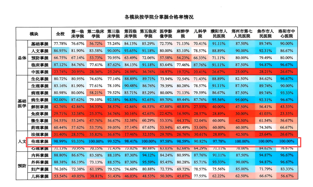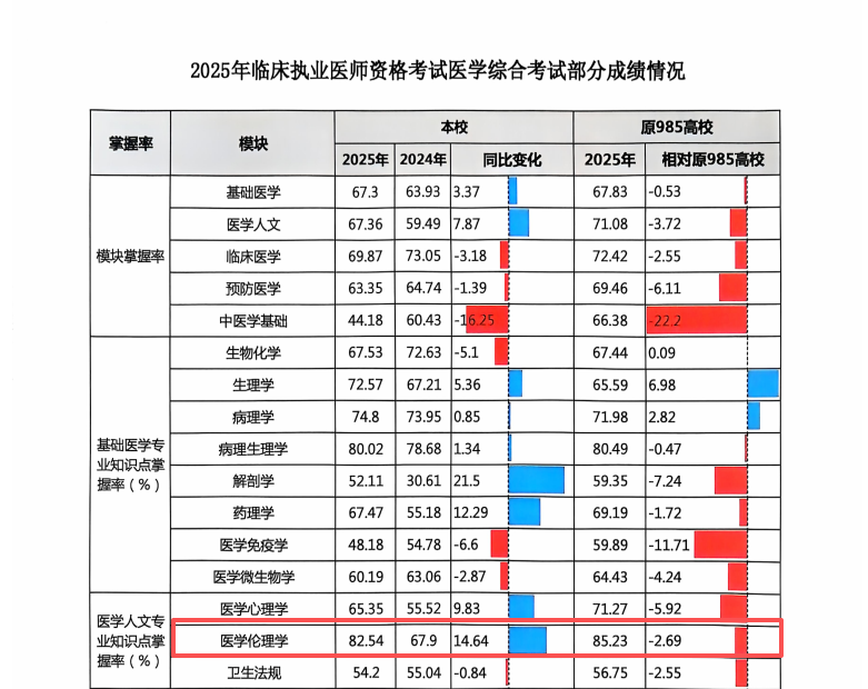 2025 年临床执业医师资格考试医学综合科目成绩公布,我校医学伦理学专业知识点掌握率为 82.54%,较 2024 年提升 14.64 个百分点,教学成效呈现稳步提升态势。在全校各临床学院掌握合格率统计中医学伦理学掌握率达 98.99%,位列全校第一。